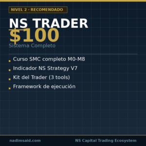 Sistema completo NS Capital. Curso SMC completo (9 módulos) + Indicador NS Strategy V7 para TradingView + Kit del Trader. La mejor relación valor/precio del ecosistema.